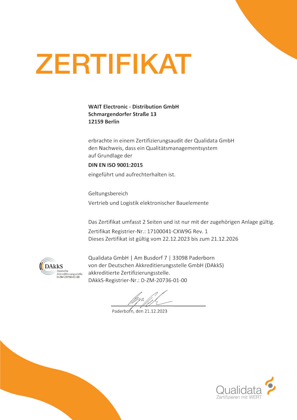 Die WAIT Electronic-Distribution GmbH versteht sich als zuverlässiger Geschäftspartner bei Handelsprozessen zur Belieferung von elektronischen Bauteilen. Sowohl gegenüber Lieferanten als auch gegenüber den Kunden bieten wir höchste Zuverlässigkeit und Qualität in der Bearbeitung der Bestellprozesse und bei den bereitgestellten Produkten. Unser Ziel sind zufriedene Kunden. Dafür haben wir uns ein Qualitätsmanagementsystem erstellt und verpflichten uns, dieses aufrechtzuerhalten und fortlaufend zu verbessern.